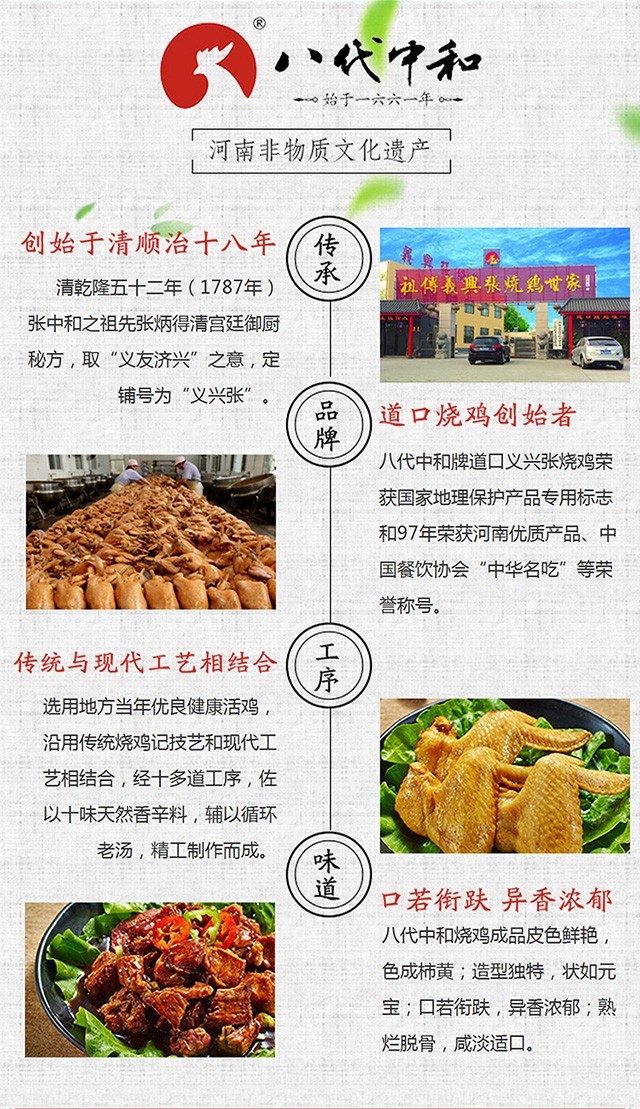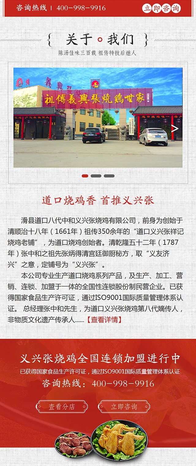 本公司生產(chǎn)道口燒雞系列產(chǎn)品,及生產(chǎn)、加工、營(yíng)銷(xiāo)、連鎖、加盟于一體的全國(guó)性連鎖股份制民營(yíng)企業(yè)。已獲得國(guó)家食品生產(chǎn)許可證,通過(guò)ISO9001國(guó)際質(zhì)量管理體系認(rèn)證。